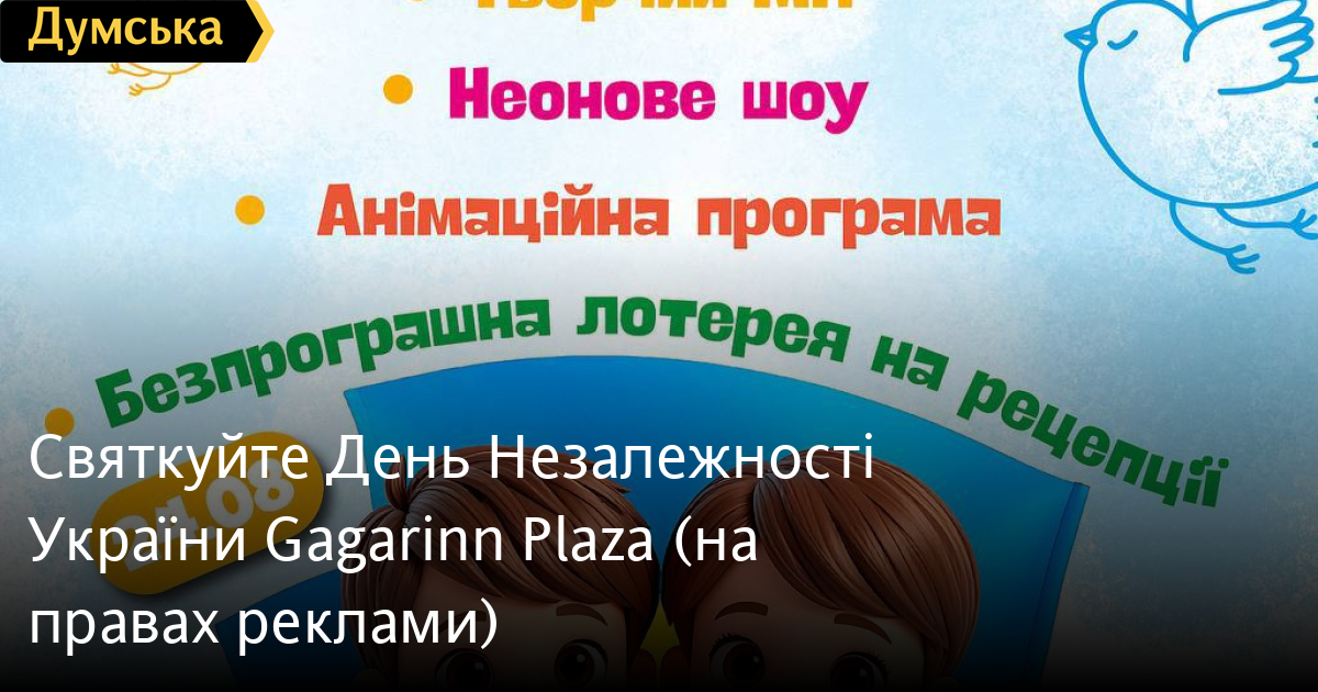 Святкуйте День Незалежності України Gagarinn Plaza (на правах реклами)Gagarinn Plaza запрошує всіх охочих відсвяткувати День Незалежності України. На гостей чекає: 🌼 Творчий майстер-клас 🌼 Яскраве неонове шоу 🌼 Весела анімаційна програма 🌼 Безпрограшна лотерея на рецепції Приходь 24 серпня з родиною та друзями – буде святково, весело й незабутньо! Адреса та сама: вул. Гагарінське плато, 5Б ТРК Gagarinn Plaza 4-й поверх СМЕРТЬ РОССИЙСКИМ ОККУПАНТАМ! Заметили ошибку? Выделяйте слова с ошибкой и нажимайте control-enter |