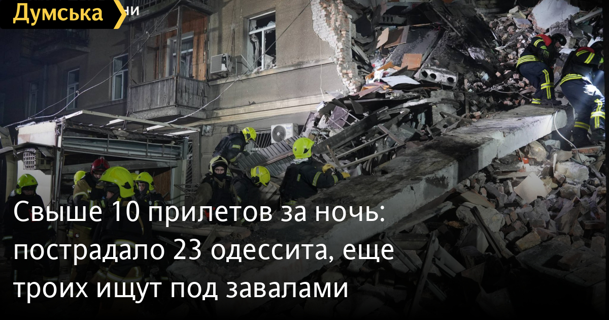 Свыше 10 прилетов за ночь: пострадало 23 одессита, еще троих ищут под завалами22 человека пострадали (среди них 5 детей) в результате ночной атаки россиян. Пожарные спасли 14 из них, поиски еще троих продолжаются, сообщают в ГСЧС и городской военной администрации. Продолжаются аварийно-спасательные работы. Привлечена кинологическая служба. Всего по городу более 10 прилетов. В результате атаки поврежден двухэтажный жилой дом. На другой локации, досталось квартире на 2-м этаже двухэтажного жилого дома. А в четырехэтажном доме разрушены квартиры последних двух этажей. В девятиэтажке горели четвертый и пятый этажи. Жители поврежденных квартир эвакуированы в Пункти незламності. На местах работают психологи ГСЧС и Национальной полиции. Установлены пункты обогрева от местных властей. Более 160 спасателей привлечены для ликвидации последствий вражеских атак. Сотрудники ЖКС ликвидируют последствия атаки. Жителям пострадавших домов помогают в оформлении документов на получение компенсации по государственной программе еВідновлення, а также из городского бюджета. ОБНОВЛЕНО в 8:55. По словам главы ОГА Олега Кипера, на данный момент количество пострадавших составило уже 23 человека. 9 человек госпитализированы, среди них 2 ребенка (девочки 2013 и 2008 года рождения) и беременная женщина на 39-й неделе. Один человек находится в тяжелом состоянии, еще восемь — в состоянии средней тяжести. Он добавил, что оккупанты выпустили по Одесской области более 50 ударных беспилотников. СМЕРТЬ РОССИЙСКИМ ОККУПАНТАМ! Заметили ошибку? Выделяйте слова с ошибкой и нажимайте control-enter
