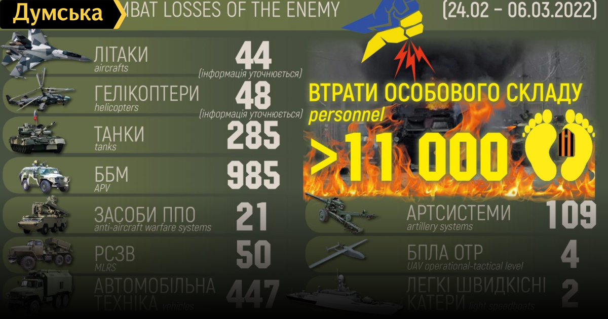 Свыше 11 тысяч единиц личного состава потеряли российские нацисты в Украине с 24 февраляОриентировочные потери противника с 24 февраля по 6 марта составили свыше 11 тысяч личного состава. Как сообщают в генштабе Минобороны, враг, несмотря на значительные потери, сотнями бросает в бой поклонников «русского мира». В частности, в Луганской области весь передний край усеян трупами и подбитой техникой захватчиков. Только вчера в центральную горбольницу захваченной «ЛНР» Брянки Луганской области с передовых позиций доставлено более 650 раненых оккупантов. Все они преимущественно в тяжелом состоянии — множественные осколочные ранения, оторванные конечности ног или рук. Из-за отсутствия в больнице свободных мест, боевики, получившие незначительные телесные повреждения (контузии, легкие ранения) даже не принимаются в медицинское учреждение. После оказания первой медицинской помощи российские нацисты перемещают их на линию боевого столкновения для ведения дальнейших боевых действий в качестве «пушечного мяса». Известно, что личный состав 6-го мотострелкового полка напуган и деморализован, ищет пути к дезертирству. Также в штабе озвучили ориентировочные данные о потерях врага в технике. Украинские воины истребили 285 вражеских танков, 985 ББМ, 109 артиллерийских систем, 50 РСЗО, 21 средство ПВО. Также уничтожены 44 самолета противника и 48 вертолетов, 447 единиц автомобильной техники, 2 скоростных катера, 60 цистерн с ГСМ, четыре БПЛА. Данные уточняются. Подсчет усложняется высокой интенсивностью боевых действий. СМЕРТЬ РОСІЙСЬКИМ ОКУПАНТАМ! Помітили помилку? Виділяйте слова з помилкою та натискайте control-enter |