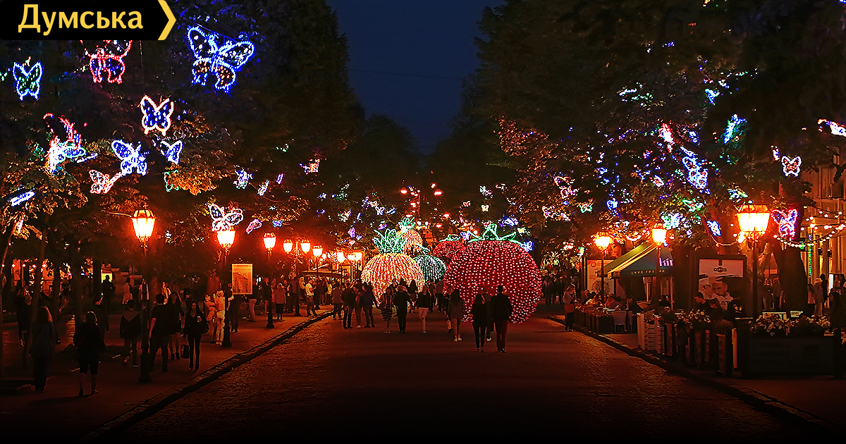 Новая иллюминация зажглась сегодня примерно в 20:30. Это стало сюрпризом для одесситов и гостей города. Всего на деревьях разместилось 1020 светящихся бабочек. Вдобавок зажглись огромные фрукты и овощи. Большие шары, которые одесситы уже наблюдали зимой, превратились в два арбуза, два ананаса и два помидора (или клубнички). Правда, один из арбузов не смог порадовать нас подсветкой, но, надеемся, эту неисправность вскоре устранят.
