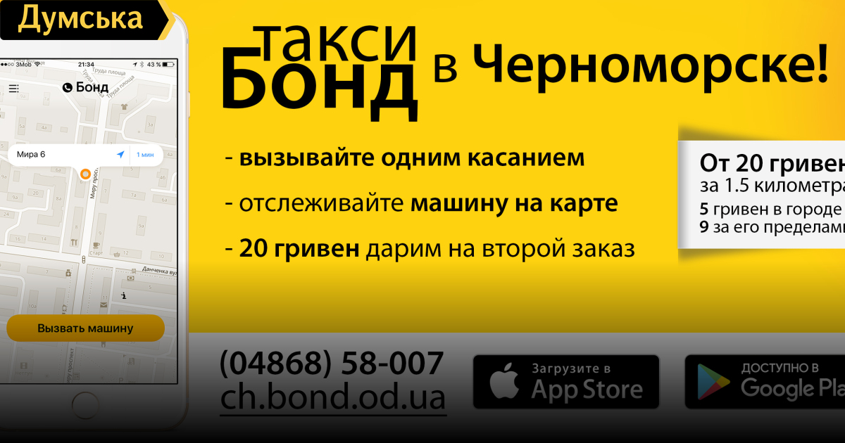 Такси «Бонд» запустилось в Черноморске. Теперь жители города могут легко вызывать такси одним касанием на своем смартфоне. Для этого нужно установить приложение такси «Бонд» на телефон. Доступен заказ такси с сайта ch.bond.od.ua и по телефону (04868) 58-007. Каждому клиенту, впервые сделавшему вызов такси из приложения, служба дарит 20 гривен скидки на второй заказ. Жителям Черноморска доступны все опции одесского «Бонда»: возможность заказать машину в один клик, видеть подъезжающую машину на карте, прямая связь с водителем, возможность оплаты банковской карточкой, опции «не звонить мне», «не люблю разговоры с водителями», «обязательный ремень безопасности на заднем сидении», заказы на время, выбор любимой радиостанции. А благодаря отслеживанию машин по GPS и продвинутым алгоритмам оценки скорости подачи авто, машины будут приезжать очень быстро — до 2-3 минут.