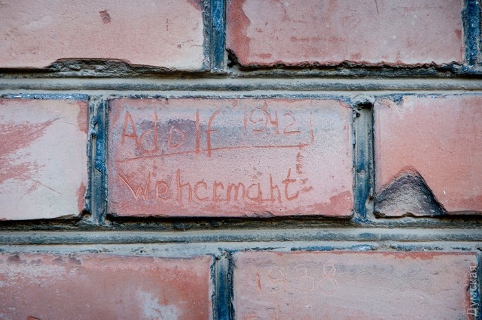 Мы воодушевились научной работой студентки ЮНПУ Дарьи Мацкул, которая начала вскрывать тайны красного замка. Историк изучала курсантские надписи на стенах училища и обнаружила много интересного. Скажем, автографы людей с русскими, украинскими и немецкими фамилиями, сделанные в 1943-м году, то есть во время оккупации. Еще она нашла фотографию того же времени, запечатлевшую трех неизвестных людей в странной униформе, не похожей на костюмы солдат королевской Румынии, — хотя, по документам, в «артухе» тогда располагалось аналогичное румынское учебное заведение.