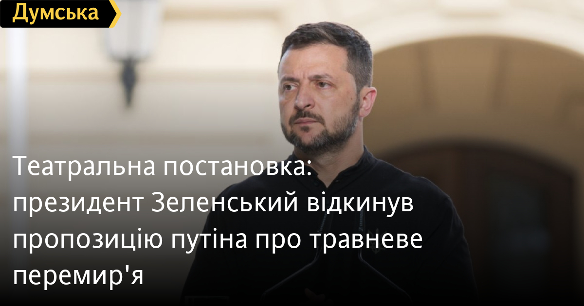 «Театральною постановкою» назвав ініціативу господаря кремля володимира путіна про триденне травневе «перемир'я» президент України Володимир Зеленський і відкинув її.