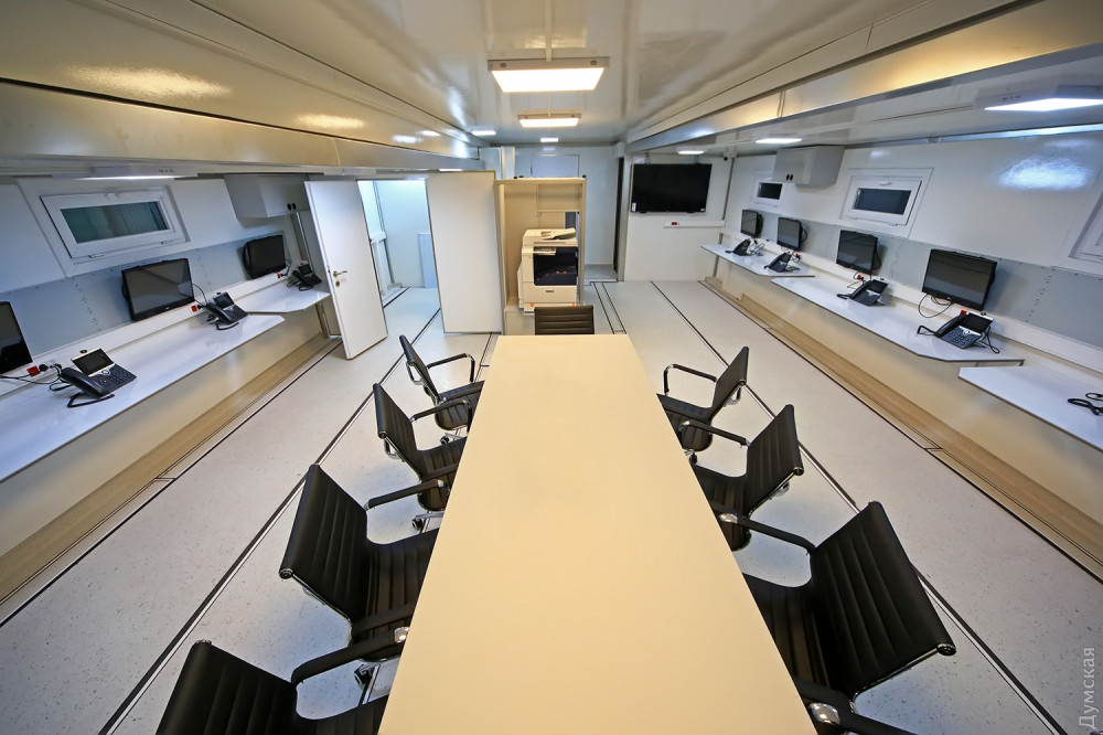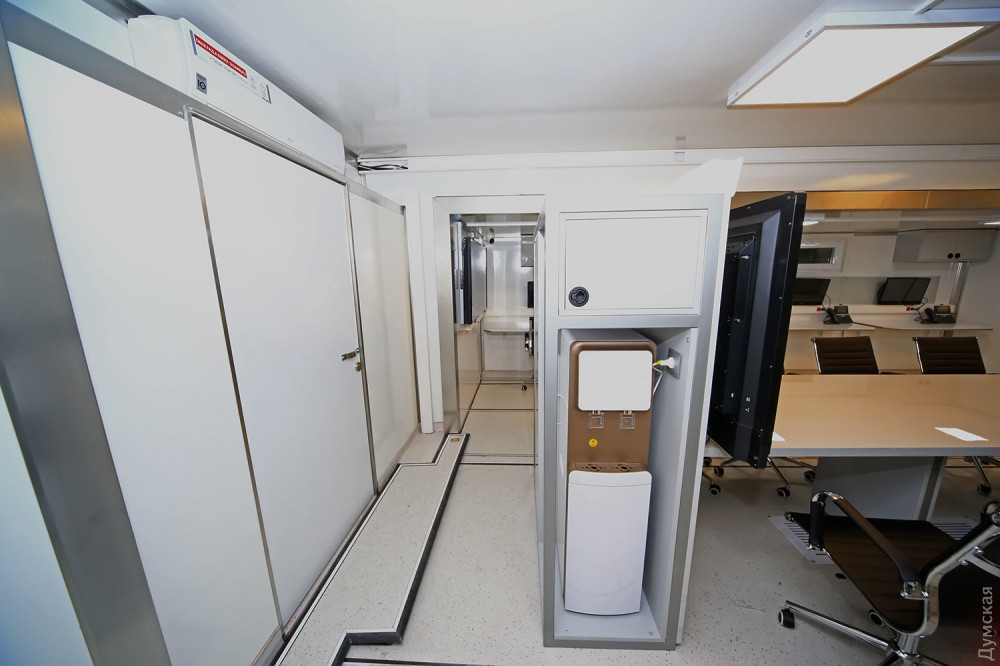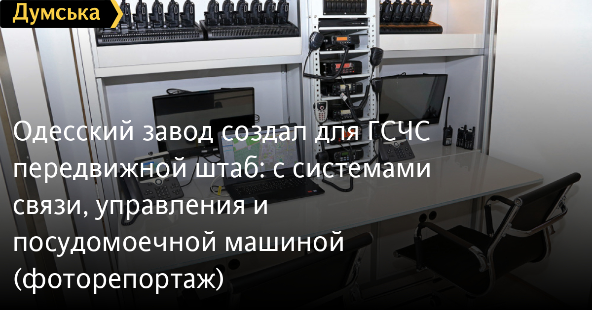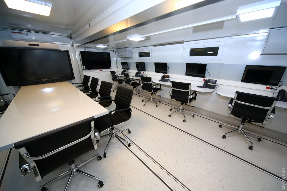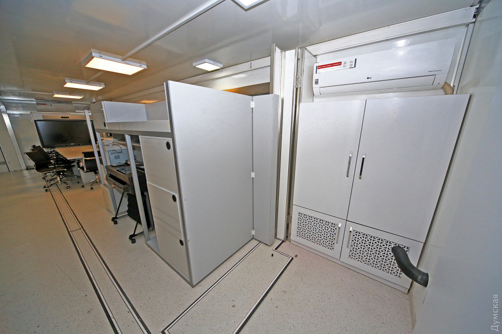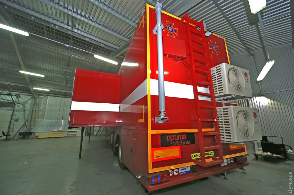 В большом заводском ангаре идут последние приготовления к сдаче необычного объекта. Вокруг 14-метрового красного прицепа с надписью «Государственная служба Украины по чрезвычайным ситуациям» суетятся рабочие и инженеры. Все основные компоненты связи для будущего передвижного штаба уже установлены и опробованы, осталось установить бытовую технику – это не только холодильник и кофеварка, но даже кулер и посудомоечная машина!