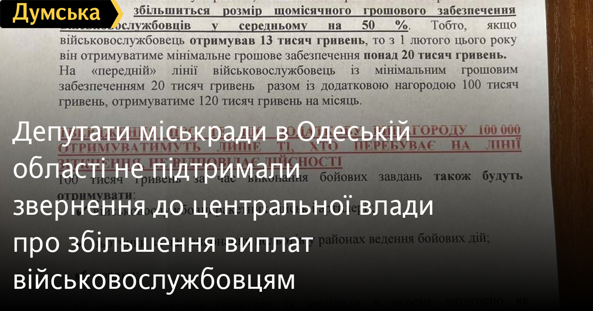Зокрема, такий документ уже зареєстрували в обласній раді. Автори звернення наголошують, що скасування доплати військовим, які «не перебувають на передовій», є абсолютно несправедливим, оскільки зони бойових дій визначають часто довільно, при цьому не враховують перебування під обстрілами з боку окупанта, ракетними атаками та їх відбиття.