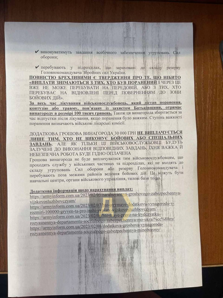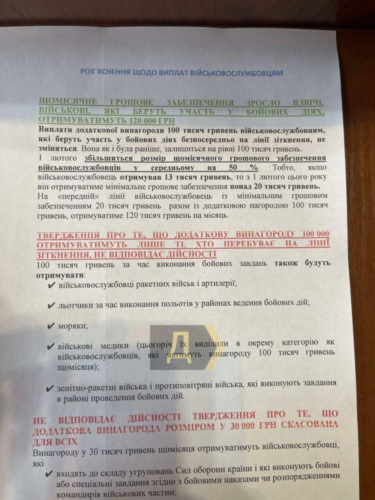 У тексті, про який говорить Янчевська, наголошують на тому, хто все ж таки отримає 100 тисяч гривень надбавки. А ось про тих, хто після «оптимізації» видатків на військових залишився не те що без 100, а деколи й без 30 тисяч на місяць — ні слова.
