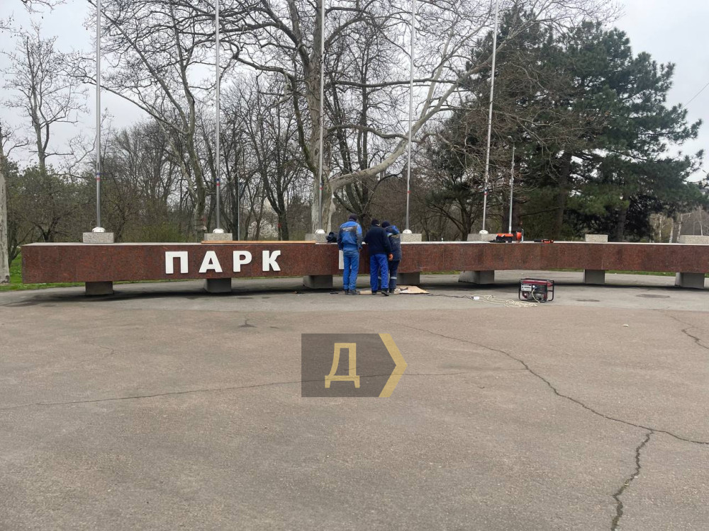 Як передає кореспондент «Думської», напис «парк Победы» зняли тиждень тому, сьогодні ж працівники КП «Сервісний центр» завершують монтаж нового — державною мовою.