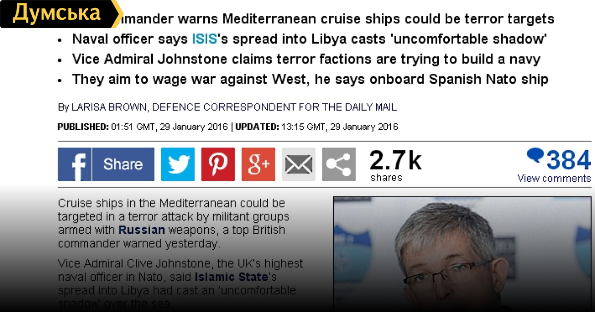 «Думская» недавно писала о том, что круизный сезон 2016 года в Черном море будет провален из-за отказа европейских круизных компаний заходить в порты Турции. С недавних пор чисто черноморских круизов проводится очень мало, и львиная доля круизников заходит к нам из Средиземного моря. Горькая правда жизни такова, что без турецких портов – Стамбула, Сипопа, Самсуна, Трабзона и Зонгулака, большим посудинам нет смысла проходить Дарданеллы и Босфор, и вероятность захода их к нам, в Одессу, практически равна нулю. Из 36 заявок на посещение Одесского порта, поданных в прошлом году, на сегодняшний день актуальными остались только четыре. Все надеялись на чудо, однако все точки над Ё расставило заявление командующего объединенными военно-морскими силами стран НАТО вице-адмирала Клайва Джонстона (Великобритания). 28 января он рассказал прессе, что террористическая организация ИГИЛ может нанести удар по круизным лайнерам в Средиземном море. «Круизные суда в Средиземном море могут стать мишенью террористических групп, оснащенных российским вооружением, — отметил британец. — Существует ужасная возможность того, что в будущем система вооружения очень высокого качества может быть применена по круизному лайнеру, нефтяной платформе или по контейнеровозу». По словам вице-адмирала, в этом регионе сейчас присутствует «значительное число игроков, которые хотят заявить о себе, и мы должны обеспечить безопасность судоходства в Средиземном море». Таким образом, есть все основания подозревать, что отказ круизников от захода в наши порты — не перестраховка, а реальная опасность. Видимо, иностранные туроператоры были предупреждены заранее о таком повороте событий, и заявление адмирала постфактум подтвердило это. СМЕРТЬ РОСІЙСЬКИМ ОКУПАНТАМ! Помітили помилку? Виділяйте слова з помилкою та натискайте control-enter |