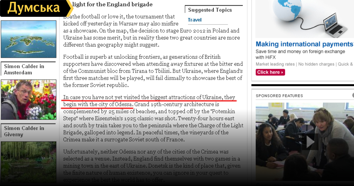 Британская газета The Independent выражает сожаление по поводу того, что Одесса и Крым не выбраны в качестве мест, где проводятся матчи Чемпионата Европы по футболу.