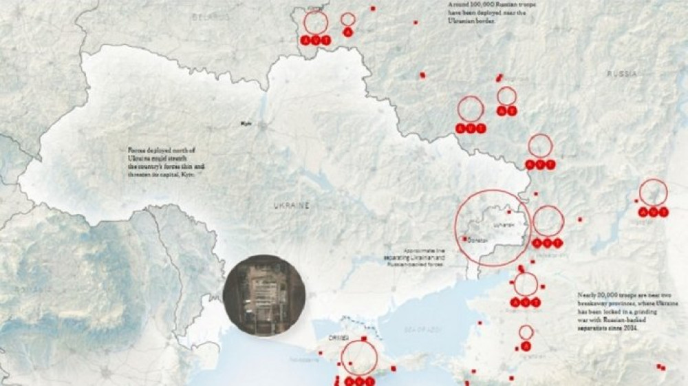 На карте, подготовленной на основе данных от украинских и западных чиновников, а также независимых военных и спутниковых снимков, обозначены род войск, их численность и виды техники.