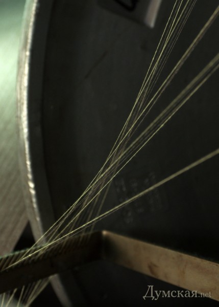 Нити приезжают на четырехкилограммовых бобинах. Перед началом процесса их нужно намотать на навои — большие металлические катушки. Это очень важный процесс, от которого зависит качество и однородность полученной ткани. В каждом таком навое — две тысячи нитей, каждая длиной в пять километров. Если кому-то придет в голову размотать и вытянуть их в одну линию, она получится длиной в десять тысяч километров — примерно как от Одессы до Лос-Анджелеса.