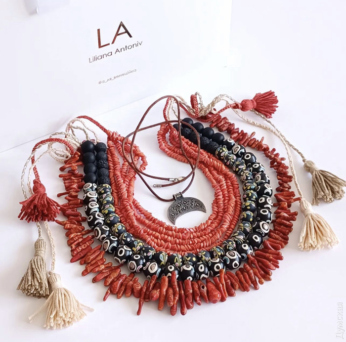 Изюминка работ дизайнера в том, что все бусины она расписывает вручную. Кроме того, автор творит из коралла и жемчуга. Несмотря на то, что большинство аксессуаров воссозданы по образцам старинных украшений, они прекрасно вписываются в гардероб современных украинок.