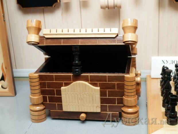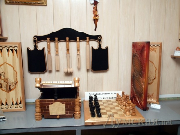 В небольшом павильончике под звучной вывеской «Товары казенного дома» — постельное белье, трикотаж, одежда, вышедшая из швейных цехов женской колонии, а также то, что называется «художественно-прикладным творчеством осужденных». Речь идет о деревянных, ручной работы, шахматах, нардах, шкатулках, статуэтках и изделиях попроще — различной кухонной утвари.