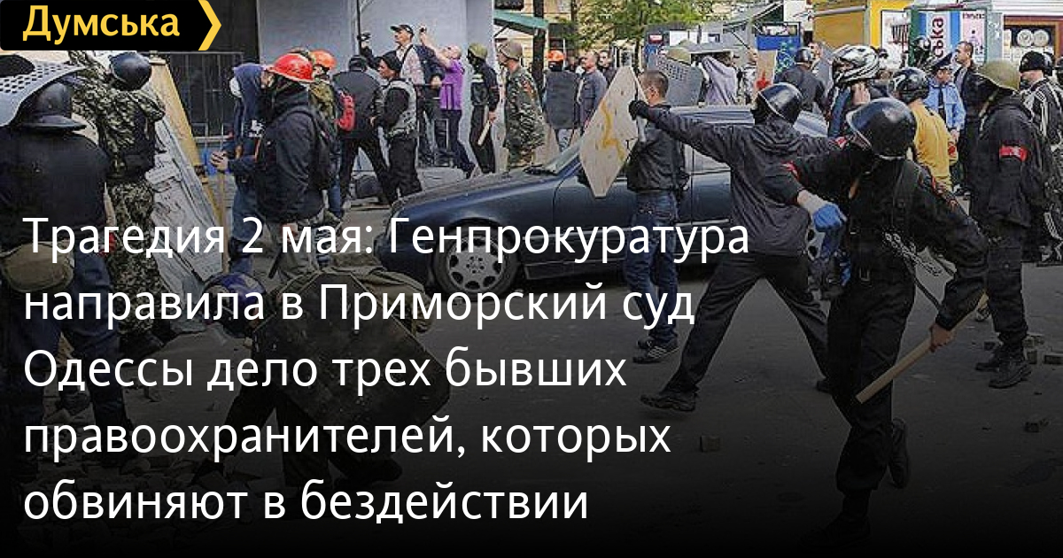Трагедия 2 мая: Генпрокуратура направила в Приморский суд Одессы дело трех бывших правоохранителей, которых обвиняют в бездействииДепартамент специальных расследований Генеральной прокуратуры Украины 30 мая передал в Приморский суд Одессы обвинительный акт в отношении трех бывших руководителей структурных подразделений ГУ МВД в Одесской области, которым инкриминируют ненадлежащее исполнение служебных обязанностей по охране общественного порядка в Одессе 2 мая 2014 года. Как сообщили в пресс-службе, бывших руководителей городского управления милиции, полка патрульной службы и отдела общественной безопасности Одесского городского управления ГУ МВД в Одесской области Андрея Нетребского, Вадима Кнышова и Вячеслава Ташматова обвиняют в совершении уголовного правонарушения, предусмотренного ч.2 ст. 364 УК Украины, а именно в умышленном бездействии вопреки интересам службы, что привело к тяжелым последствиям — гибели 48 человек и получении 197 людьми телесных повреждений, а также к материальному ущербу на сумму около 214 тысяч гривен. Кроме того, Андрею Нетребскому и Вадиму Кнышову вменяют совершение уголовного правонарушения, предусмотренного ч.3 ст. 135 УК Украины – заведомое оставление без помощи людей, находившихся в состоянии, опасном для жизни, что привело к гибели 42 человек. Суд избрал для обвиняемых меру пресечения в виде личного обязательства. Напомним, ранее в рамках этого уголовного производства по событиям 2 мая 2014 года в Приморский суд направлены обвинительные акты в отношении бывшего начальника ГУ МВД Украины в Одесской области Петра Луцюка и его заместителя Дмитрия Фучеджи. Также был направлен в суд обвинительный акт в отношении троих сотрудников городского управления милиции по факту незаконного освобождения 4 мая 2014 года 64 человек, задержанных во время беспорядков 2 мая. СМЕРТЬ РОСІЙСЬКИМ ОКУПАНТАМ! Помітили помилку? Виділяйте слова з помилкою та натискайте control-enter
