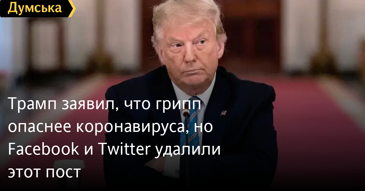 Трамп заявил, что грипп опаснее коронавируса, но Facebook и Twitter удалили этот постПрезидент США Дональд Трамп разместил пост, в котором заявил, что сезонный грипп опаснее, чем новый коронавирус. «США научились жить с гриппом, точно так же, как мы учимся жить с COVID, который большинству населения менее смертоносный», — отметил политик. На это заявление быстро отреагировала социальная сеть Фейсбук, которая удалила пост, пояснив свое решение тем, что «мы удаляем неправдивую информацию о серьезности Covid-19 и удалили это сообщение». За пост Трампа отреагировала и администрация Twitter, которая скрыла твит президента США из-за нарушения правила о распространении потенциально вредоносной информации. Но пользователи все еще могут прочесть твит, над которым стоит метка с предупреждением, нет комментириев, лайков и ретвитов. СМЕРТЬ РОСІЙСЬКИМ ОКУПАНТАМ! Помітили помилку? Виділяйте слова з помилкою та натискайте control-enter Новини по цій темі: 4 березня 2023: "Вакцини-довгожителі", або Як щеплення проти COVID-19 перетворилися в Україні на небезпечний ритуал 27 січня 2023: МОЗ зобов`язали опублікувати договори на закупівлю вакцин проти COVID-19: апеляційний суд задовольнив позов журналіста "Думської" 11 січня 2023: За тиждень в Одесі зафіксовано 159 випадків ковіду 4 січня 2023: За тиждень в Одесі зареєстровано 113 випадків ковіду |