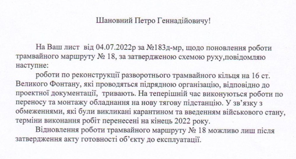 18-й и 19-й трамвайные маршруты, обслуживающие жителей Большого Фонтана и Дачи Ковалевского, до конца года не запустят.