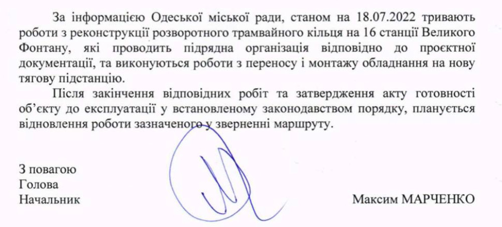 Об этом «Думской» со ссылкой на официальные ответы КП «Одесгорэлектротранс» и Одесской военной администрации сообщил глава транспортной комиссии городского совета Петр Обухов.