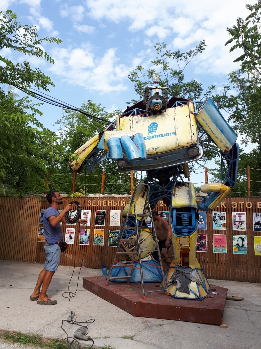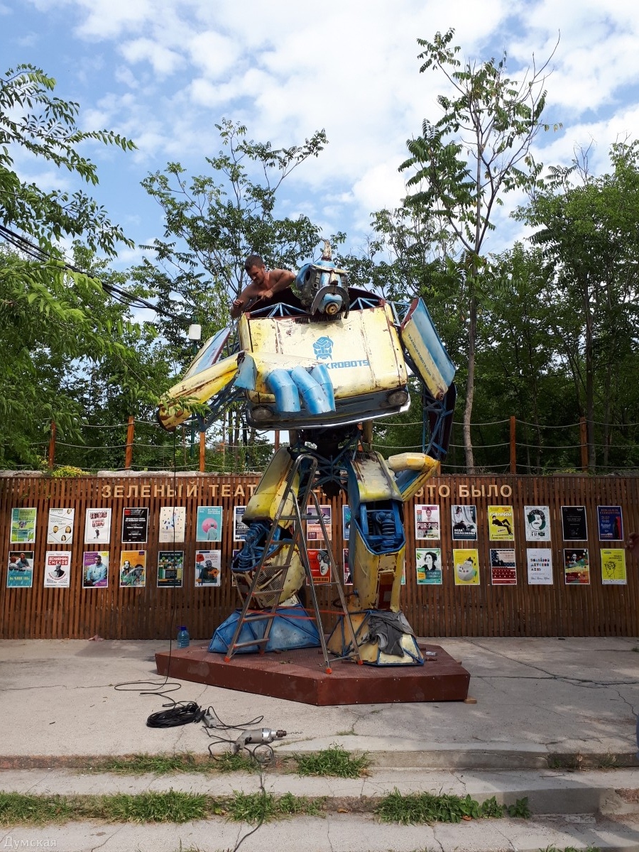 Трансформера высотой четыре метра сегодня заканчивают устанавливать на территории Зеленого театра. Автор композиции Александр Милов рассказал, что робот собран из старого «Запорожца», который он за копейки купил у пожилого жителя Жеваховой горы. Высота трансформера — 4 метра, вес - больше тонны. Милов любя называет свое творение «дедушка Бамблби». Напомним, Александр Милов известен своими масштабными проектами. Так, его композиция «Любовь» произвела фурор на фестивале «Burning man» в пустыне Блэк-Рок (США, штат Невада). А в 2015 году скульптор превратил памятник Ленину, стоящий на территории «Прессмаша», в Дарта Вейдера. СМЕРТЬ РОСІЙСЬКИМ ОКУПАНТАМ! Помітили помилку? Виділяйте слова з помилкою та натискайте control-enter Новини по цій темі: 15 липня 2021: Зеленый театр справил 85-летний юбилей выставками, перформансами и праздничным тортом 29 травня 2019: В Зеленом театре упало дерево: пострадала кофейня (фото) 8 серпня 2018: Провокация ФСБ? Встречу с нобелевским лауреатом в Одессе отменили из-за угроз "националистов" (видео) 13 березня 2018: Зеленый театр в парке Шевченко продолжит свою работу: команде удалось договориться с владельцами 14 грудня 2017: Зеленый театр получил кадастровый номер |
