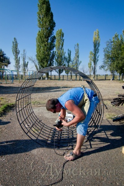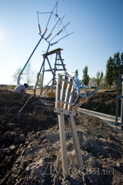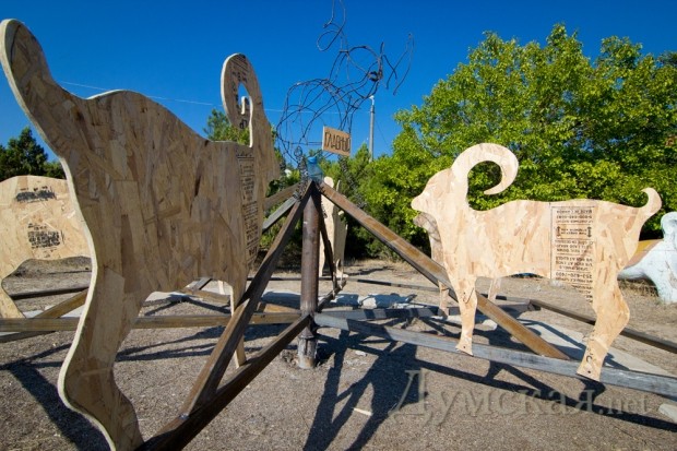 Необычный памятник создал автор из Минска Юра Гетьман. Он рассказал нам, что хотел сотворить что-то парадоксальное, не вписывающееся в место и время проведения феста. Так на берегу Черного моря появились гигантские сани.