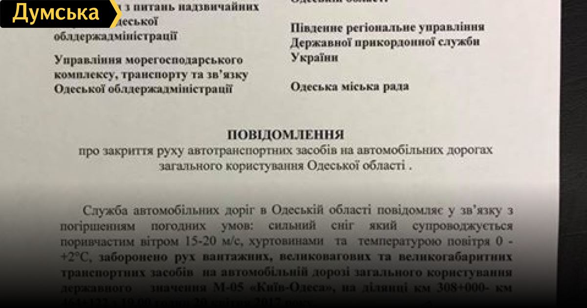 Служба автомобильных дорог в Одесской области сообщает о закрытии дороги Одесса — Киев для грузовых и крупногабаритных машин. Как сообщил начальник службы Олег Варивода, ограничение действует на участках 308+000 км и 464+122 км с 19:00 четверга. Связано это с ухудшением погодных условий — сильным снегопадом, который сопровождается порывистым ветром, метелью и низкой температурой воздуха. Ранее сообщалось, что движение по трассе Одесса-Киев затруднено из-за непогоды и дорожно-транспортного происшествия, случившегося в районе Знаменки Ивановского района Одесской области. В районе аварии возникли многокилометровые пробки. На место выехали подразделения ГСЧС и полиции, которые должны обеспечить нормальный проезд машин. СМЕРТЬ РОСІЙСЬКИМ ОКУПАНТАМ! Помітили помилку? Виділяйте слова з помилкою та натискайте control-enter Новини по цій темі: 14 квітня 2020: На севере Одесской области выпал снег (видео) 31 березня 2020: В Одесской области выпал снег (фото, видео) 24 квітня 2017: В Килие вода продолжает подтапливать жилые дома 24 квітня 2017: После непогоды в Одесской области восстановили электроснабжение еще не всех населенных пунктов 21 квітня 2017: В ближайшие часы на Одесскую область обрушится жестокий шторм |