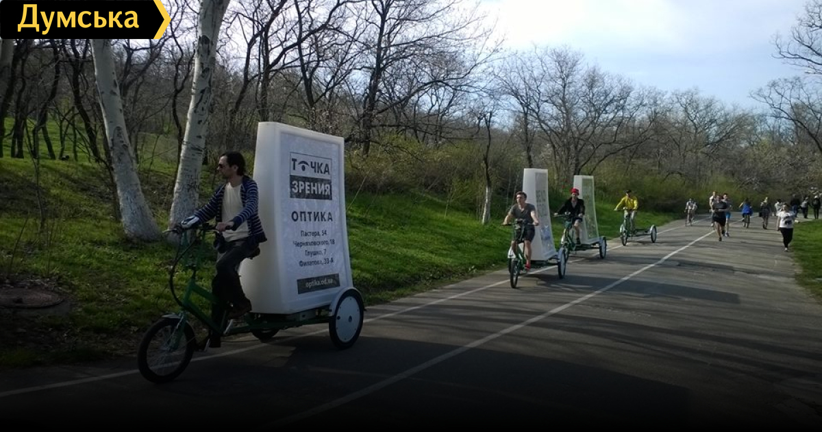 Такая мобильная велореклама, отметим, вошла в моду относительно недавно. В прошлом году ее замечали в Киеве и других городах. Изначально конструкция велоборда предполагала обычный велосипед с прицепом, на котором и размещалась реклама. Одесские же рекламщики пошли дальше и выпустили в зеленые зоны трехколесные велосипеды, специально переоборудованные для перевозки щитов.