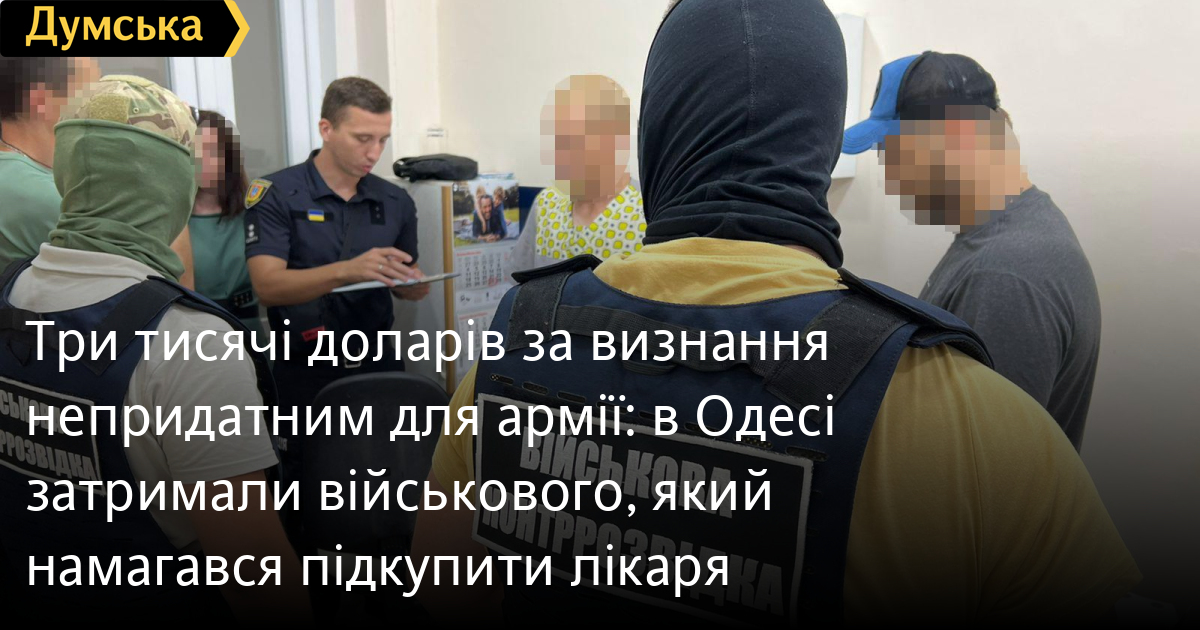 42-річний фігурант пропонував лікареві три тисячі доларів за допомогу у звільненні від служби, повідомляють у пресслужбі поліції.