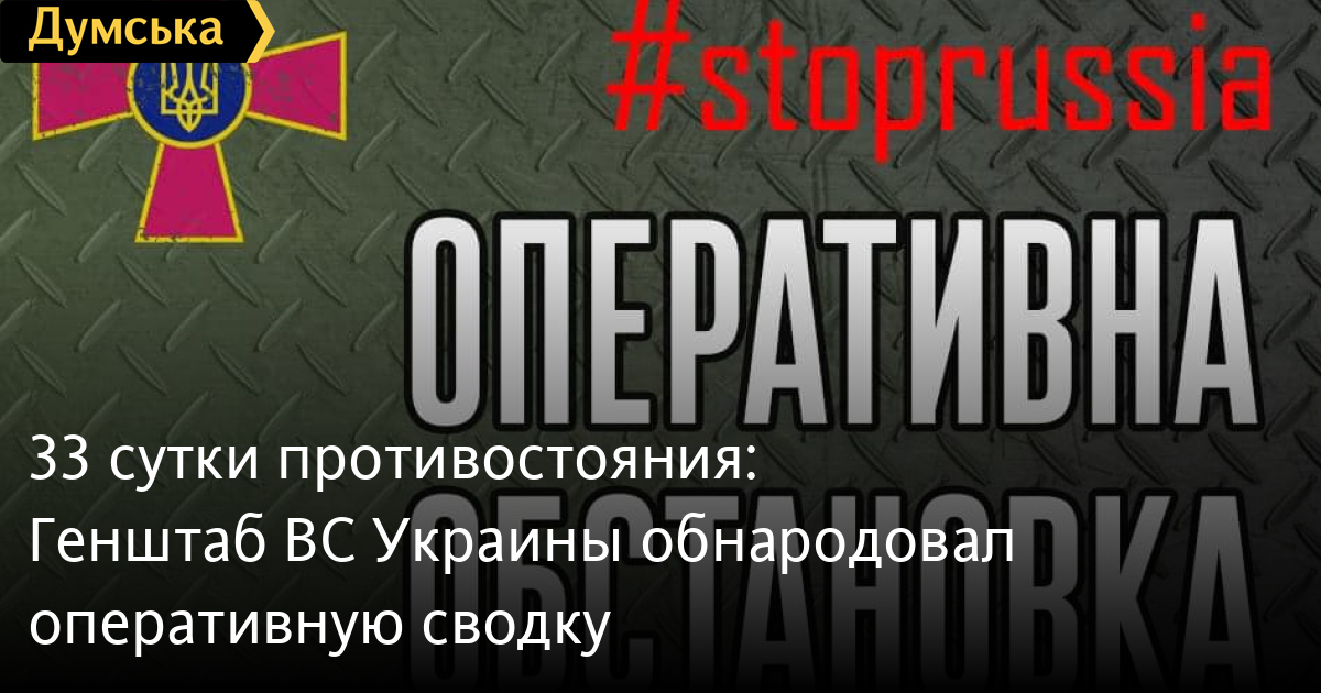 Оперативную информацию о героическом противостоянии Украинского народа российскому военному вторжению на 6:00 тридцать третьих суток обнародовал Генштаб Вооруженных сил Украины.
