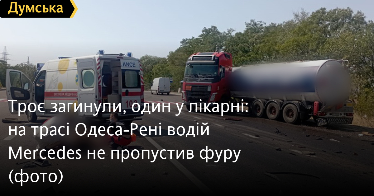 Троє загинули, один у лікарні: на трасі Одеса-Рені водій Mercedes не пропустив фуруТри людини загинули, а ще одна опинилася в лікарні в результаті ДТП, яка сталася вранці 18 серпня на трасі Одеса-Рені. Як повідомили в пресслужбі поліції області, на розі між Белгород-Дністровським і Старокозачим 52-річна водійка мінівена Mercedes Benz виїхала з другорядної дороги на перехрестя з головною і не поступилася дорогою автопоїду Volvo. В результаті аварії водій легковика і двоє її пасажирів – жінка і чоловік – загинули до приїзду медиків. Підліток, який був з ними в авто, госпіталізований з численними травмами. 42-річного водія вантажівки перевірили на стан сп'яніння – він був тверезий. Чоловік не постраждав. Через аварію рух транспорту в цьому районі весь день був ускладнений. СМЕРТЬ РОСІЙСЬКИМ ОКУПАНТАМ! Помітили помилку? Виділяйте слова з помилкою та натискайте control-enter Новини по цій темі: 30 серпня 2025: Машина вилетіла в кювет: мер Рені потрапив в аварію, його мати загинула, а маленький син у лікарні (фото) 28 липня 2025: П'яний на "Ягуарі" або гіпертонік? Звільнений топ-посадовець одеської поліції хоче повернутися на службу 2 квітня 2025: В Одесі водій BMW спровокував аварію, в якій постраждали п`ятеро людей, і втік (фото, відео) 17 березня 2025: Непрофесіоналізм чи злий умисел? В Одесі аварію з двома постраждалими оформили як адмінпорушення 23 грудня 2024: Через аварію рух на Іванівському мосту майже паралізовано (фото) |
