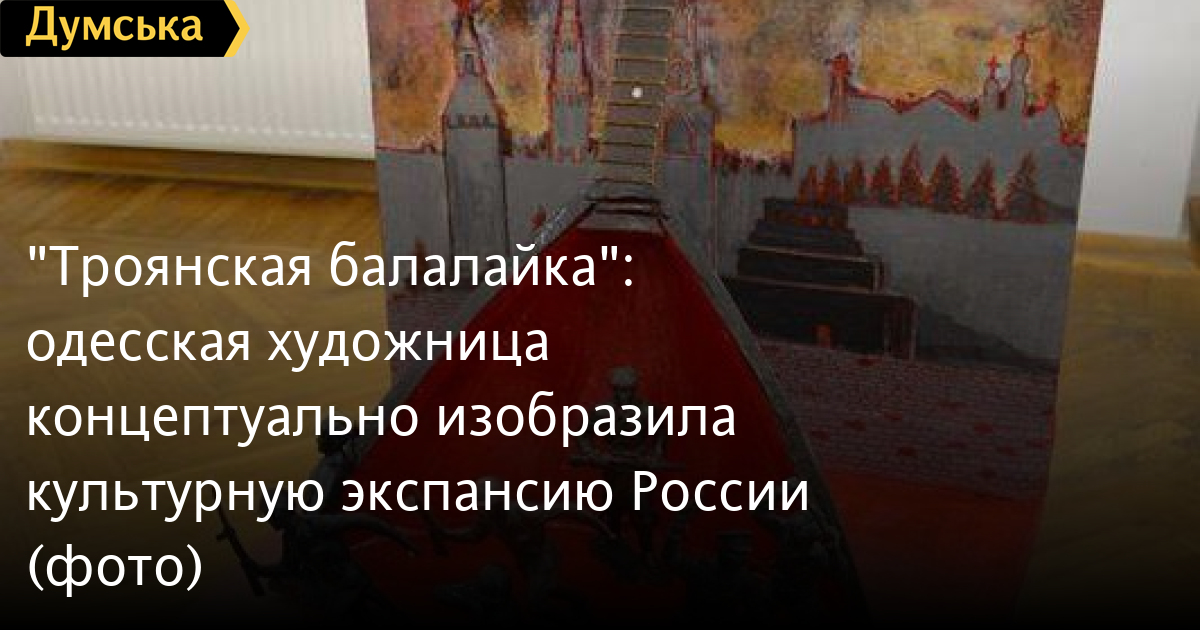 «Это работа о культурной экспансии, которая превращается в экспансию военную, — рассказала «Думской» автор. — Сначала все телевидение, радиоэфиры, книжные полки в магазинах заполнены российским продуктом, а потом к нам приходят «вежливые» люди. За «балалайками» в наш дом проникают российские солдаты.