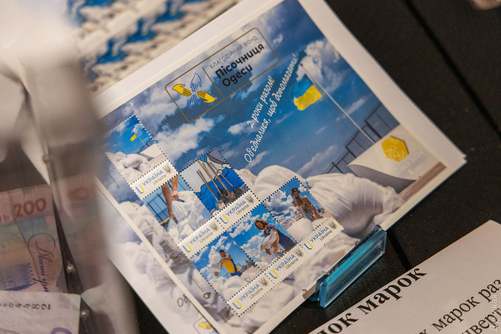 У перші тижні війни знаковим місцем став Собачий пляж, туди щодня приходили сотні городян, щоб заготовляти мішки з піском для захисних споруд — цій темі, зокрема присвячені роботи Віктора Скрипника. Саме тоді утворився волонтерський рух «Пісочниця», який потім переріс у благодійну організацію, що підтримує дітей в Одесі та на деокупованих територіях. БО «Пісочниця» стала генеральним партнером виставки. Частину коштів, зібраних від продажу марок і листівок, організатори передадуть на допомогу дітям.