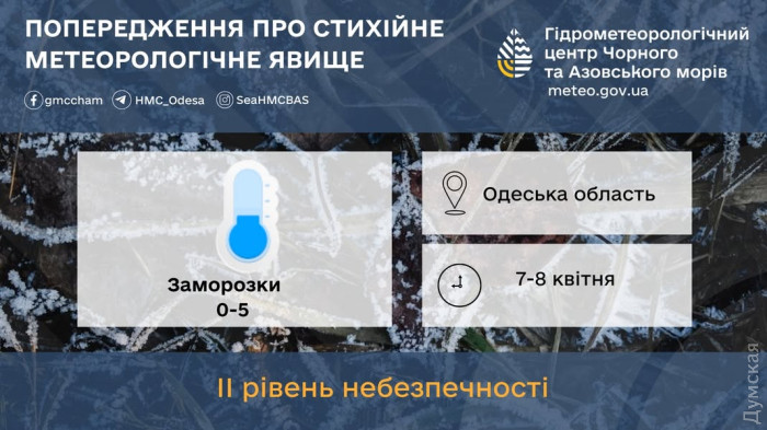Туман зміниться грозою та заморозками: на Одещині на три дні оголосили штормове попередженняЗамість туману, який накрив Одесу та область, у неділю прийде дощ з грозою, а на початку тижня очікуються заморозки. Про небезпечні метеорологічні явища повідомляють у Гідрометцентрі Чорного та Азовського морів. В Одесі у першій половині ночі 6 квітня оголошено І (жовтий) рівень небезпечності у зв’язку з грозою. Вдень також прогнозують невеликий дощ. Вітер південно-західний, вранці та вдень північно-західний, 9-14 м/с. Температура вночі +4-6°С, вдень +7-9°С. В Одеській області у неділю температура вночі +1-6°С, місцями 0-2°С, вдень +5-10°С. Однак вже вночі та вранці 7-8 квітня в регіоні очікується заморозок до -5°С, через що оголошено про стихійне метеорологічне явище ІІ рівня небезпечності (помаранчевого). СМЕРТЬ РОСІЙСЬКИМ ОКУПАНТАМ! Помітили помилку? Виділяйте слова з помилкою та натискайте control-enter |