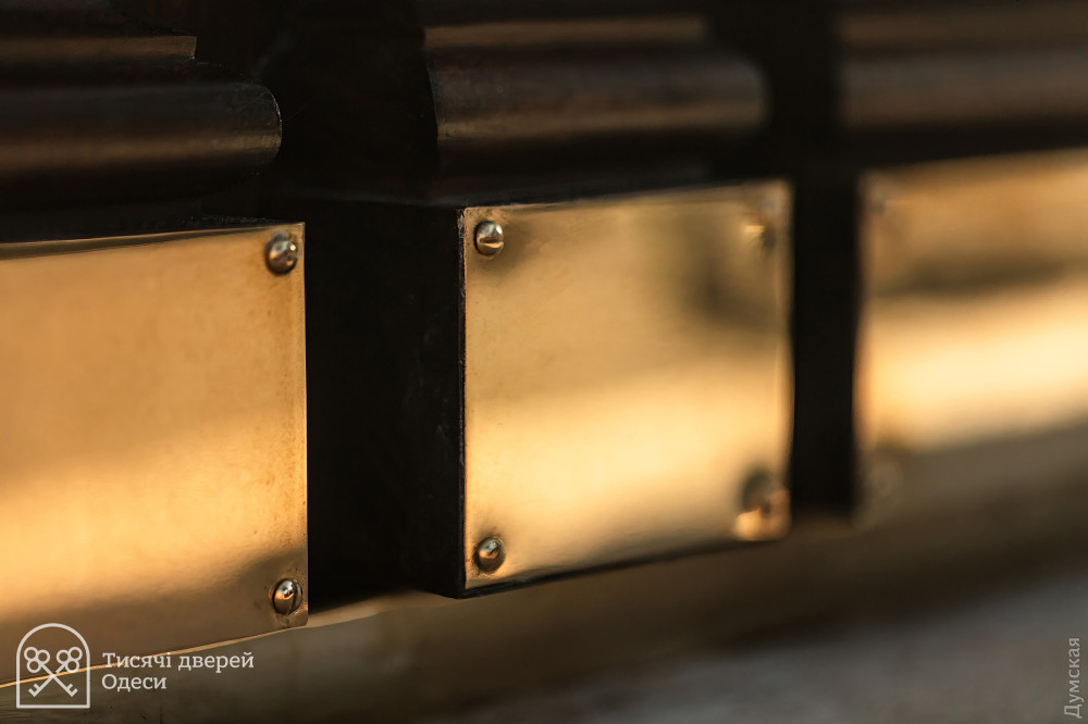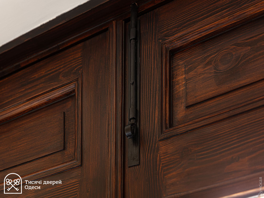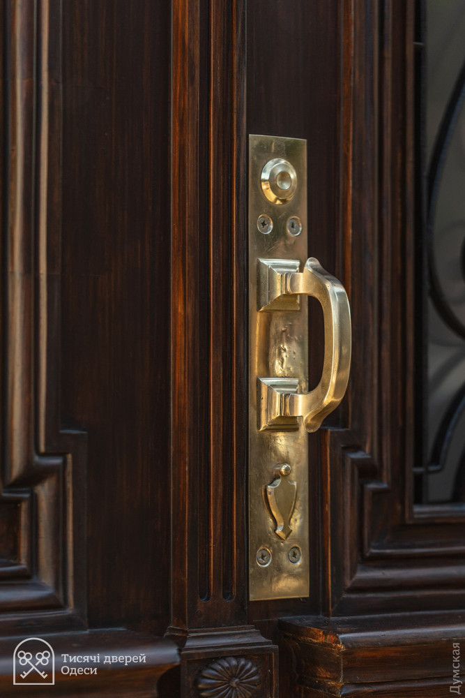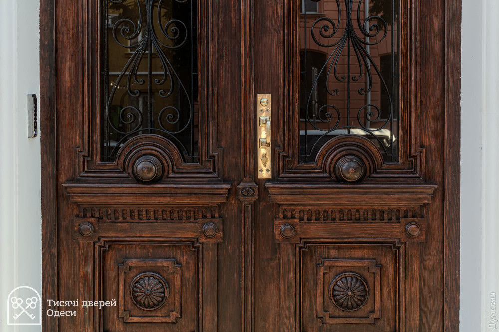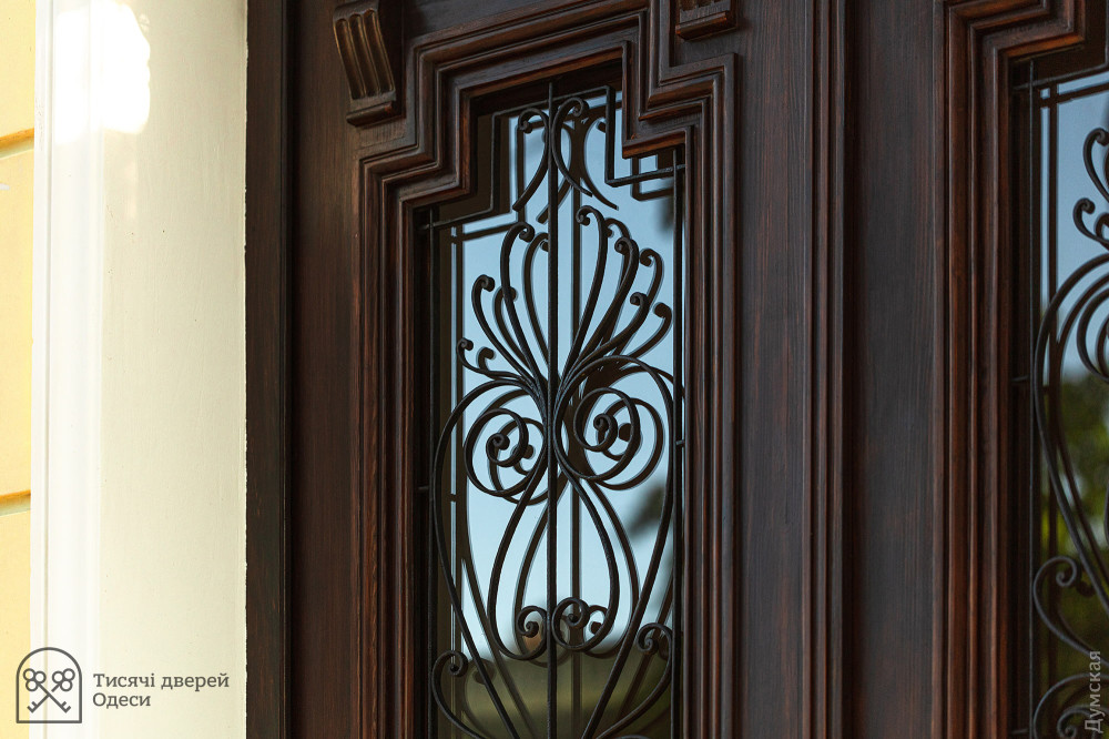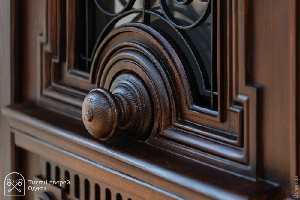 Об'ємні дерев'яні декоративні елементи під світловими прорізами витончено доповнюють імпозантність дверей і також можуть слугувати в ролі ручки. Кована решітка у світлових отворах акуратно реставрована, а кожна загублена клепка відтворена за старовинною технологією.