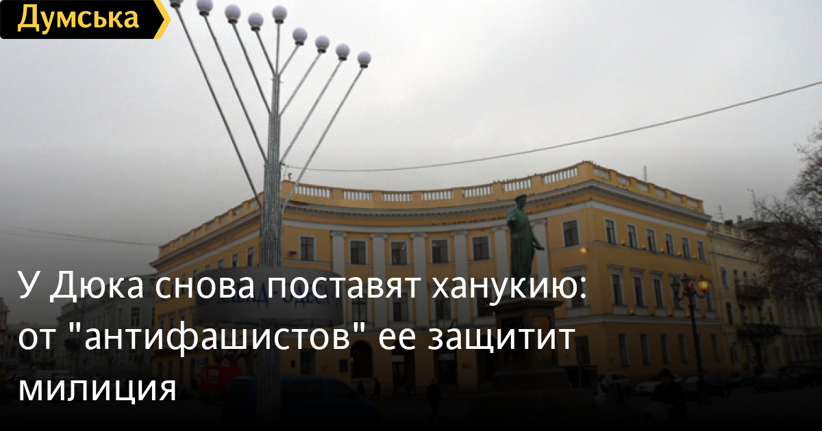 Напомним, в прошлые годы против установки ханукии протестовал ряд пророссийских организаций города, называющих себя также «антифашистскими». В 2012-м году активисты так называемой «Партии Сталина» и организации «Евреи против Гурвица» поставили у Дюка православный крест, на котором была прикреплена листовка с текстом о «зверски замученном иудейскими изуверами» последнем российском императоре Николае II Романове.