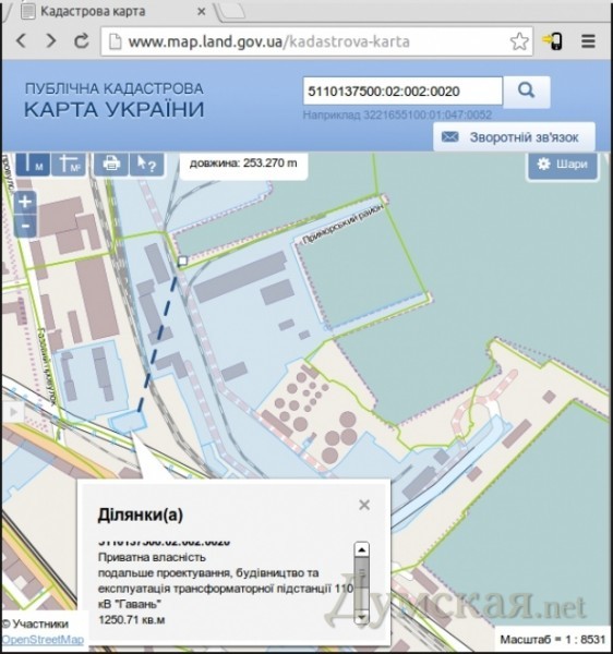На заседании обнародовали открытую информацию из кадастровой карты Украины . Как оказалось, у ПАО есть госакт на земельный участок площадью 1250 кв. м., предназначенный для дальнейшего проектирования, строительства и эксплуатации подстанции 110 кВ. Название — «Гавань».