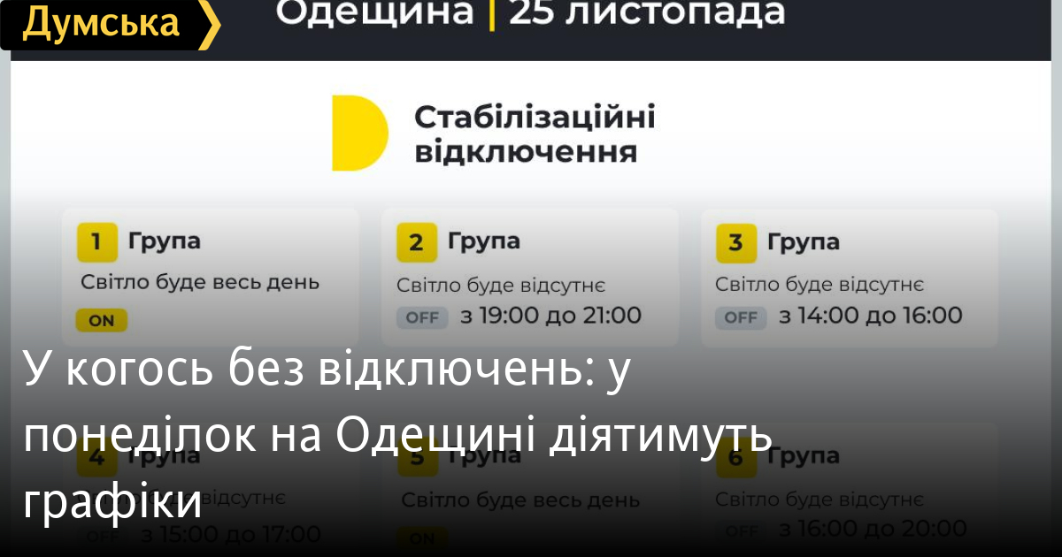 У когось без відключень: у понеділок на Одещині діятимуть графікиГрафіки стабілізаційних відключень діятимуть по всій Україні завтра з 14:00 до 20:00. Як повідомили в «Укренерго», без світла залишиться одна черга. В одеському ДТЕК склали графік, згідно з яким у першій і п'ятій групі світло не вимикатимуть взагалі. СМЕРТЬ РОСІЙСЬКИМ ОКУПАНТАМ! Помітили помилку? Виділяйте слова з помилкою та натискайте control-enter |