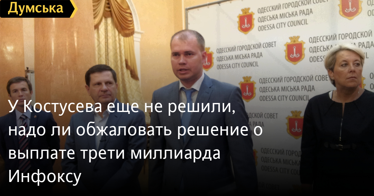 В свою очередь Одесский городской голова Алексей Костусев отказался отвечать на вопрос депутата горсовета Георгия Селянина о том, каковые дальнейшие действия города в тяжбе с «Инфоксом», но отметил, что «его тоже беспокоит эта тема и он ею занимается» (напомним, решение суда первой инстанции обжаловала в суде прокуратура, а не мэрия).