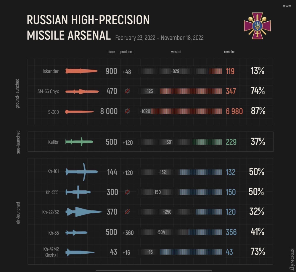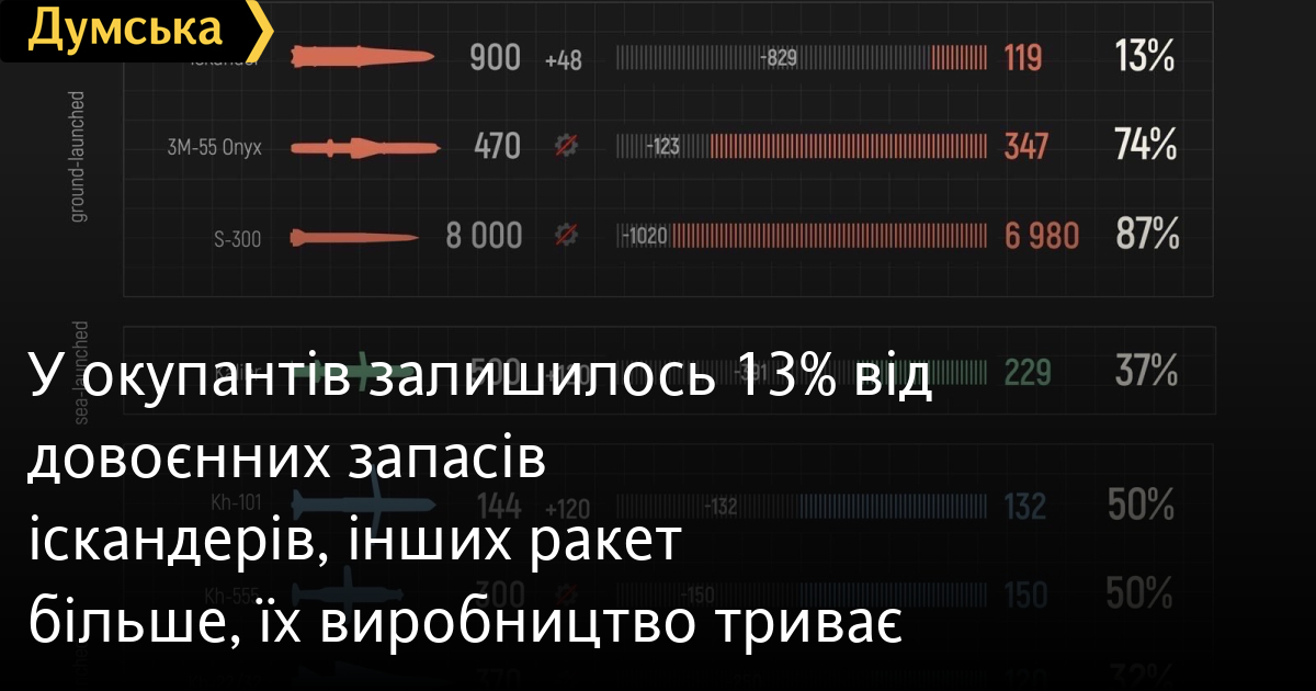 Судячи з опублікованої головою оборонного відомства інфорграфіки, найбільше окупанти витратили ракет типу «Іскандер» — із 900 ракет у запасі залишилося 119 (13%), проте за майже дев'ять місяців повномасштабного вторгнення росіяни побудували 48 нових ракет цього типу.
