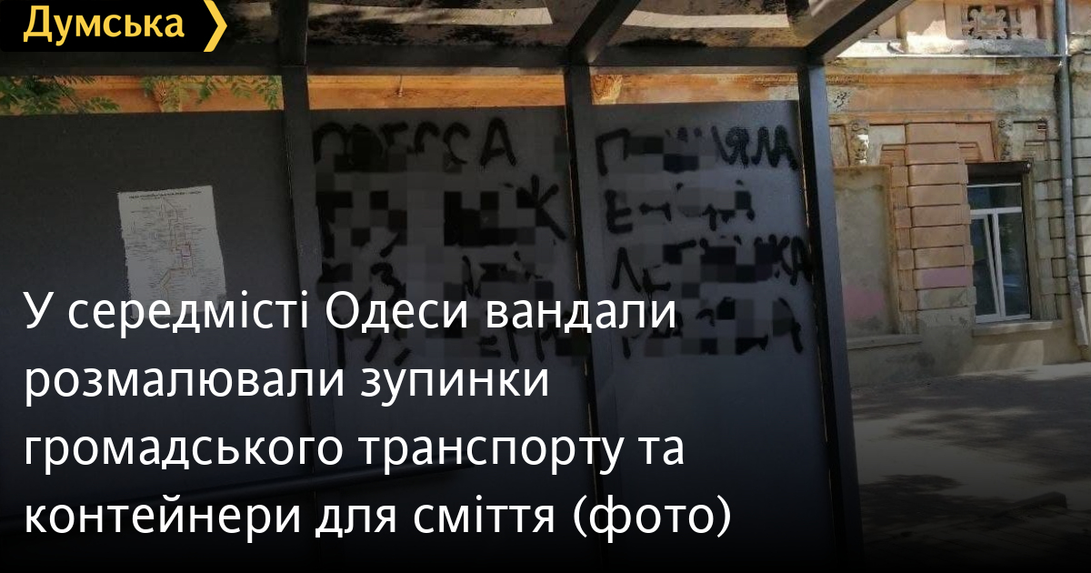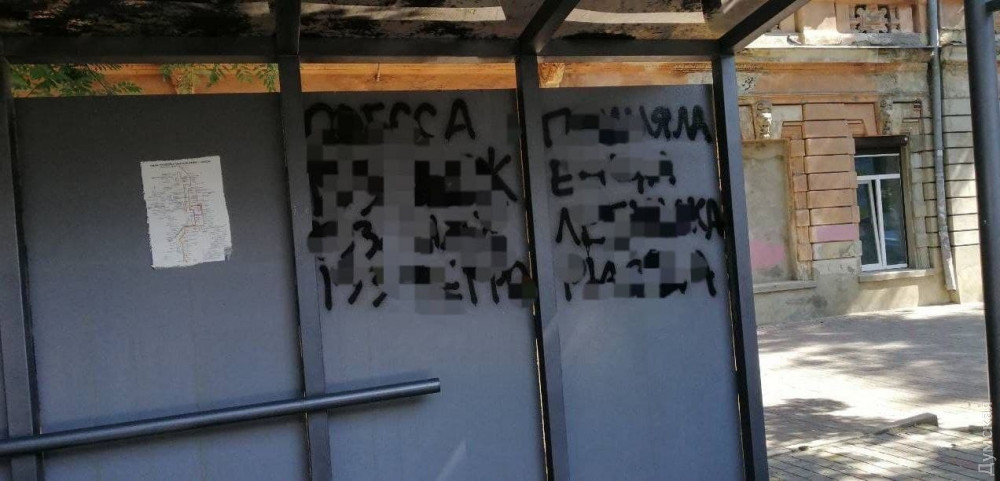 У міськраді повідомили, що невідомі залишили «потворні написи» на зупинках громадського транспорту вздовж вулиці Адмірала Лазарева, а також контейнери для сміття на Соборній площі.