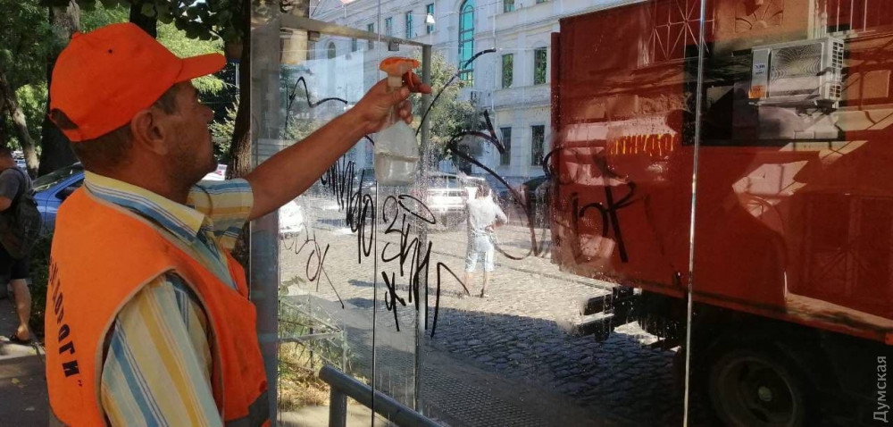 Нагадаємо, учора комунальники також затерли написи на Ланжеронівських сходах та зупинці на Жуковського.