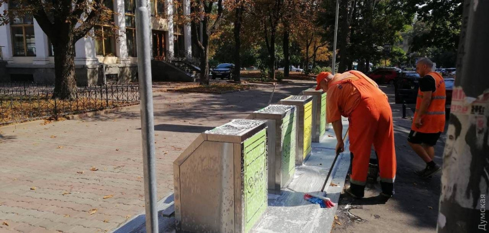 Співробітники КП «Міські дороги» прибрали наслідки діяльності вандалів з двох об’єктів міської інфраструктури у центрі Одеси.