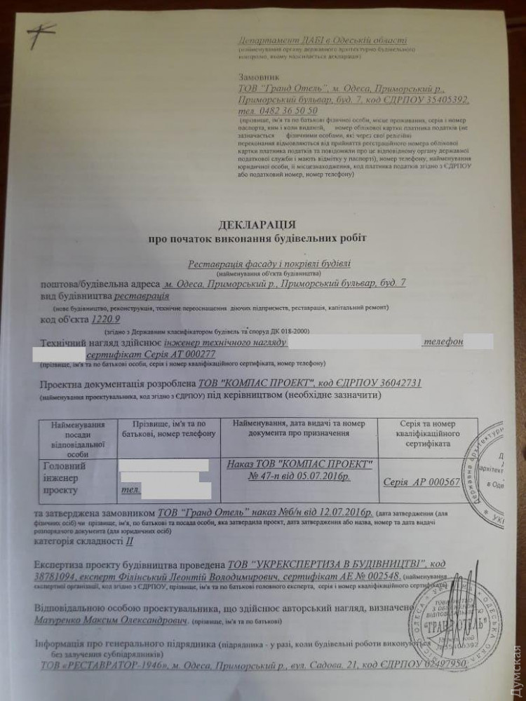«У компании «Гранд-отель» (входит в группу «Инкор» Руслана Тарпана, — Ред.) есть законный охранный договор с государственной службой по охране культурного наследия министерства культуры Украины. Согласно договору, предметом охраны являются наружные стены здания, выходящие на Приморский бульвар. Все остальное — кровля, внутренние фасады, как и внутренние помещения здания — в соответствии с законом не попадают под охранный договор», — говорится в заявлении компании.