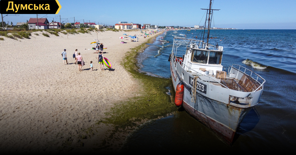 Возле судна отчетливо пахнет соляркой, но купаться в этой части пляжа и так невозможно: в воде — сплошная зеленая каша из водорослей.