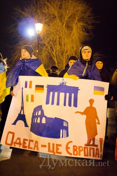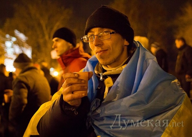 Участники одесского Евромайдана, который после скандального судебного запрета проходит в форме встречи с депутатами городского совета от опозиционных политсил, решили внести немного креатива в довольно-таки трудное, с учетом погодных условий, дело борьбы за ассоциацию с Евросоюзом.