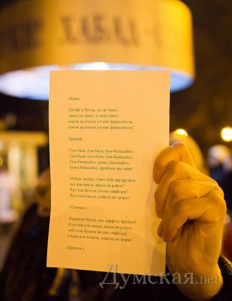 Далее митингующим раздали отпечатанные тексты популярной еврейской песни «Тум-балалайка» и предложили совместно исполнить ее под аккомпанемент приглашенного скрипача.