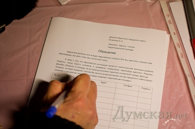 После этого, по уже сложившейся традиции, любой желающий смог высказать все, что наболело, в микрофон, а также оставить свою подпись под обращением к депутату городского совета Остапенко с просьбой внести на рассмотрение сессии проект решения о присвоении территории возле памятника Дюку названия «Европейская площадь».
