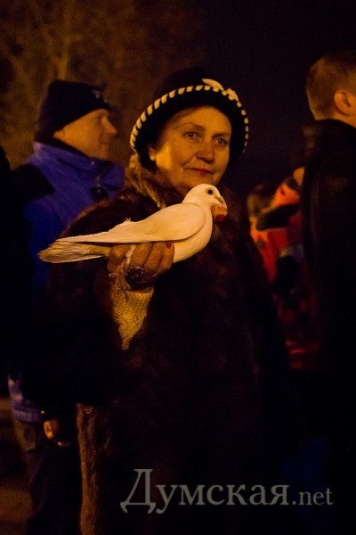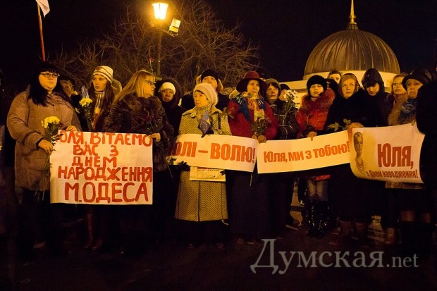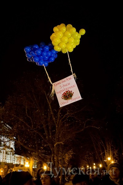 Как сообщает наш корреспондент, сегодня митинг начался со здравиц в честь заточенной в темнице Юлии Тимошенко, которая отмечает свое 53-летие. Всем присутствовавшим на митинге женщинам подарили красные и белые розы. Кроме того, в небо взлетели белые голуби и небольшой транспарант, влекомый надувными шарами в цветах национального флага, с надписью «Цветы для Юли. С Днем Рождения! Одесса — Харьков».