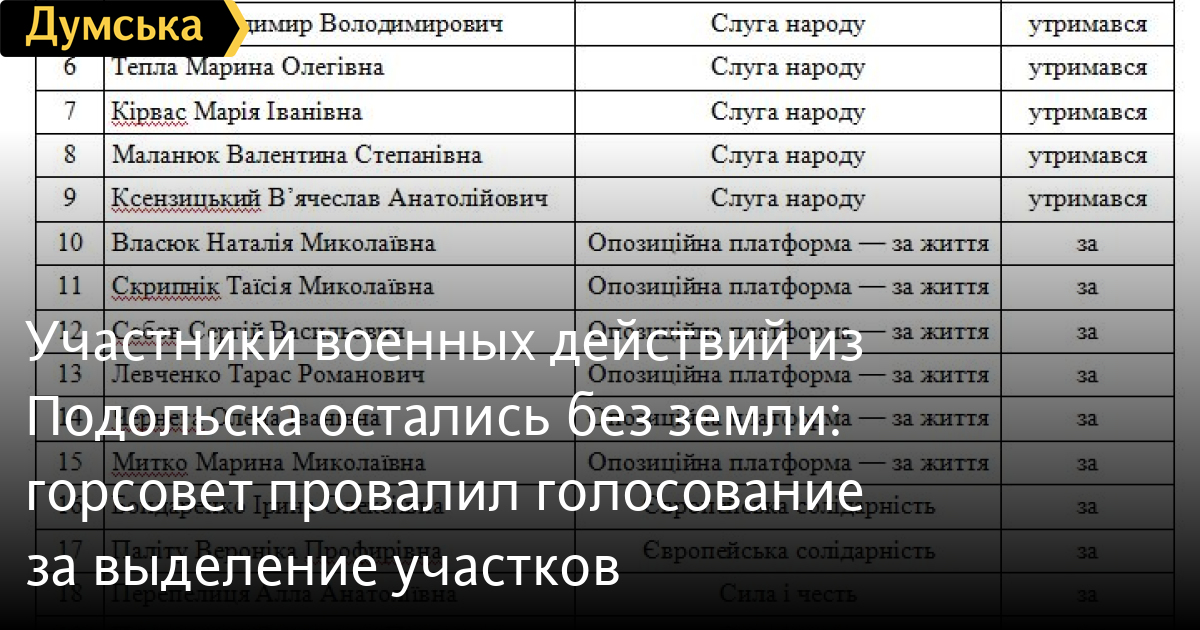 Подольский горсовет не поддержал выделение земли участникам боевых действий. Для принятия проекта решения не хватило шести голосов. «Слуги народа» фактически саботировали голосование.