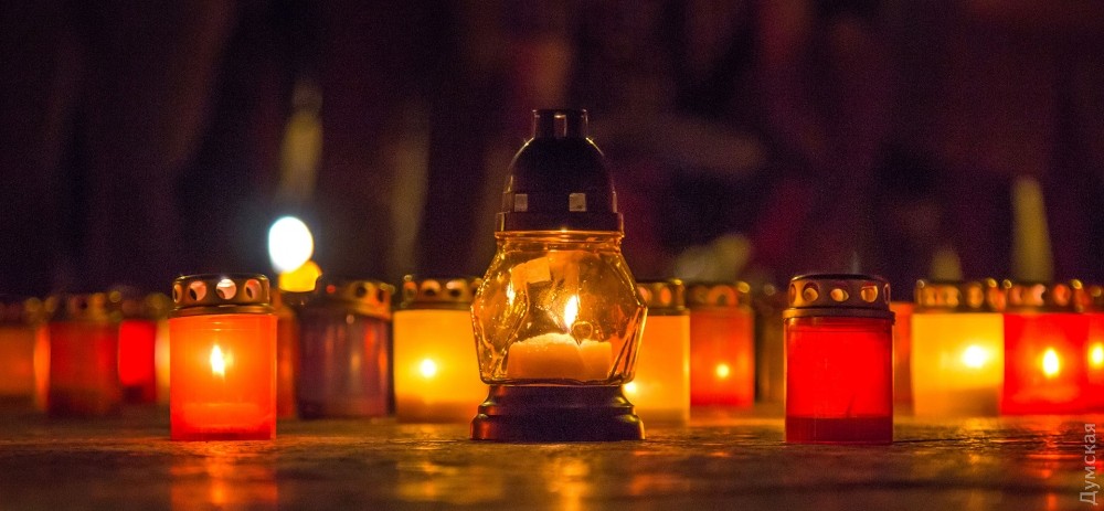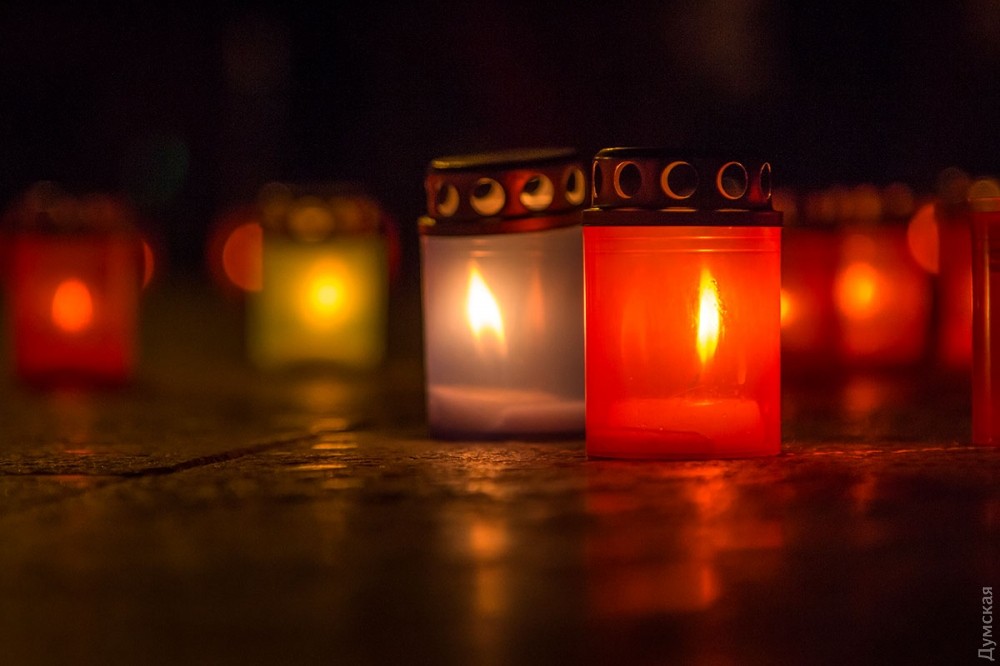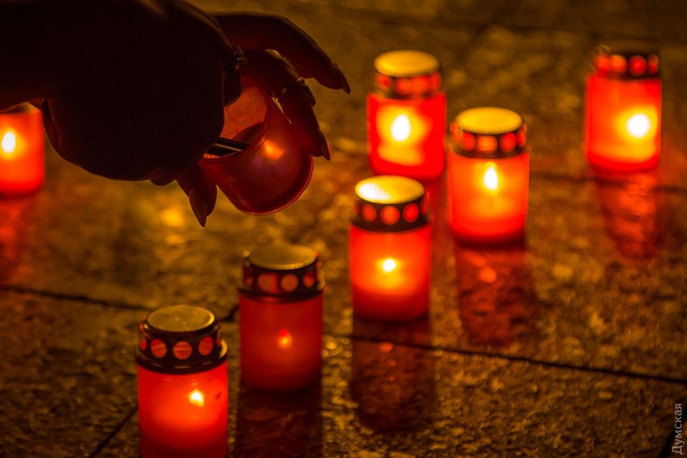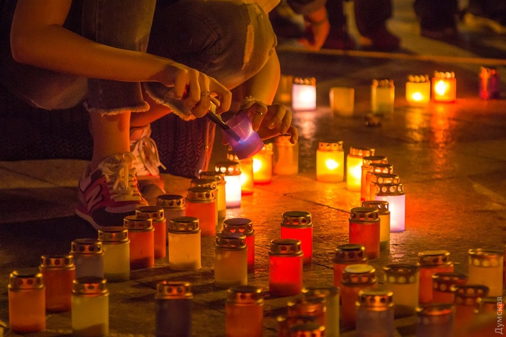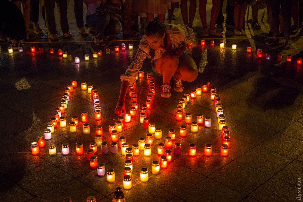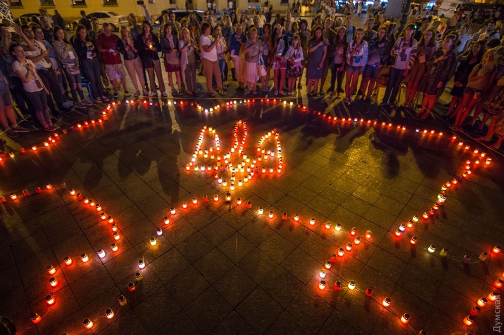 Возле Дюка горящими лампадками выложили контуры Украины. В центре горел трезубец.