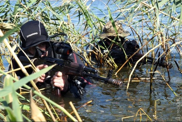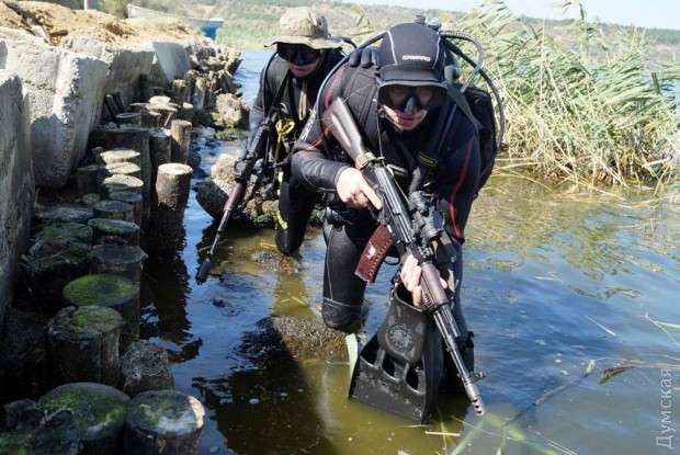 Поработали, оттачивая свое мастерство, и бойцы водолазной группы. Под толщей воды они приблизились к противнику и застали его врасплох.