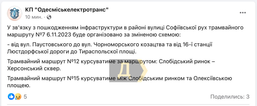 Трамвай № 7 временно изменит схему движения из-за повреждения инфраструктуры в центре Одессы.